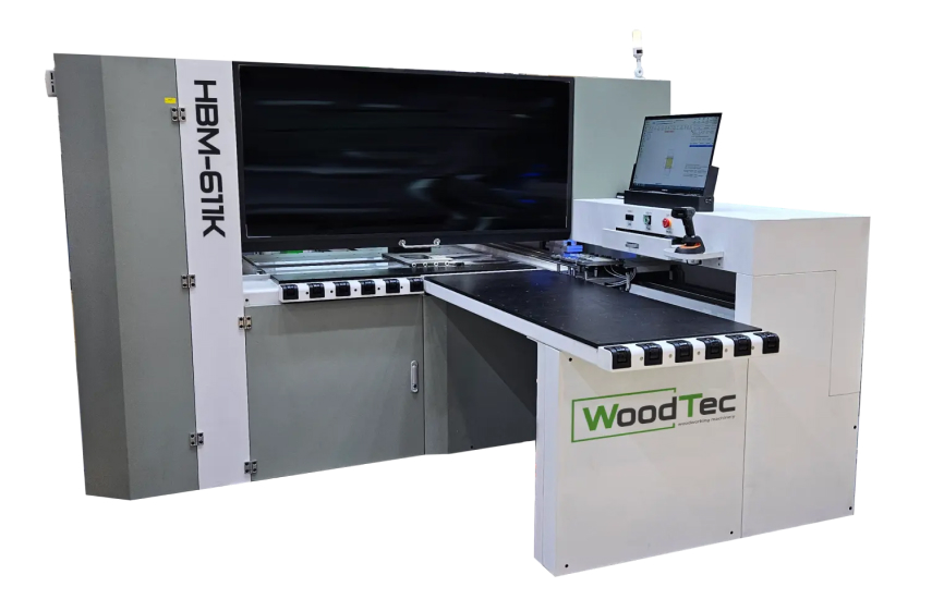 WoodTec HBM 611K – надежный и производительный сверлильно-присадочный станок с ЧПУ с двумя сверлильно-присадочными группами: одна сверху, одна снизу и двумя фрезерными шпинделями: один сверху, один снизу, предназначенные для высокоскоростного и точного, глухого и сквозного сверления плоскостей и торцов мебельных деталей, с возможностью фрезерования паза, выборки, снятие четверти.