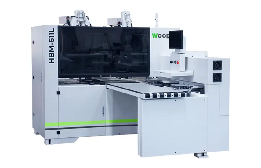 WoodTec HBM 611L – надежный и производительный сверлильно-присадочный станок с ЧПУ с двумя (одна сверху, одна снизу) сверлильно-присадочными группами и фрезерными шпинделями (один сверху, один снизу), предназначенный для высокоскоростного и точного, глухого и сквозного сверления плоскостей и торцов мебельных деталей, с возможностью фрезерования паза, выборки, снятие четверти.